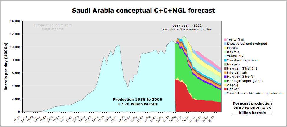 At the ASPO conference in Houston, October 2007, I gave a presentation on Saudi Oil reserves and a production forecast that was born out of several posts by Stuart Staniford, myself and others which are linked at the end of this article. In my talk (which can be found here on the ASPO server) I presented the forecast shown below and afterwards an elderly gentleman who I did not know at that time, was keen to show me a paper that he and Richard Duncan had published some 8 years earlier that was titled "Encircling the peak of World Oil Production". The gentleman, who I would later learn was Walter Youngquist wanted to show me that their forecast for peak Saudi oil production was 2011, the same date which I had determined from a rather different approach.