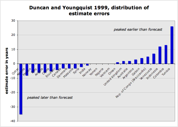 In a recent post Nate brought to our attention the work of Richard Duncan and Walter Youngquist published in 1999 in a paper called Encircling the Peak of World Oil Production. In 2007 I performed a simple analysis of the reliability of their forecasts for 26 countries (out of 42 country forecasts that were published) that were checked against what had actually come to pass as documented in the BP statistical review of world energy. The results are shown above. The sum of the differences is -7 years which on average is -0.3 years per country.